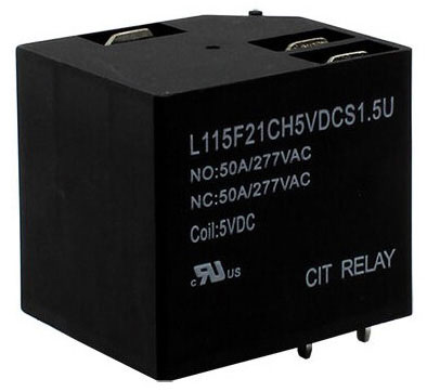CIT Relay and Switch L115F2 series rugged relays offer 50 A switching with a wide range of coil voltage options. With strong resistance to shock and vibration, the L115F2 series is UL/cUL certified. Coil voltage options range from 5 VDC to 48 VAC and coil power 0.9 W or 1.5 W with a low profile option.
