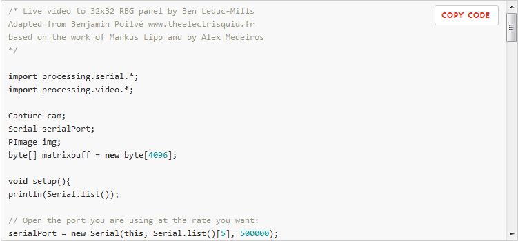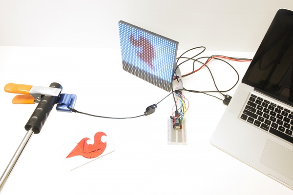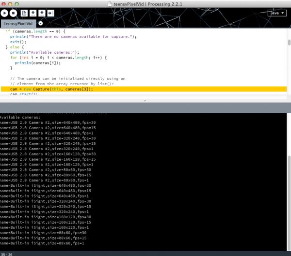Now for the big finish! Plug in the RGB Panel power supply to a wall outlet, the Teensy 3.1 and webcam get plugged in to your computer’s USB ports. Now start the Processing sketch; it will take a little bit to start up as it goes through all the available cameras (if you have a Mac you’ll notice the green light on your iSight flash on and off once or twice). Once it starts up, a little preview box will pop up on your computer, and your RGB matrix should come to life, with the image from the webcam showing up (somewhat pixelated) on the RGB panel.
