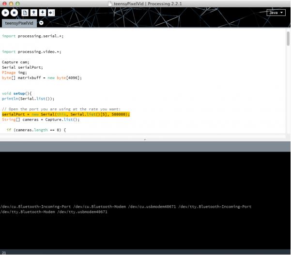 will need to reflect the actual serial port your Teensy 3.1 is connected to. So you’ll want to replace the ‘5’ in brackets with the number reflective of the array index belonging to your port, which is to say: running this code will cause Processing to print out a list of serial ports, and you need to pick the place in this list that your Teensy is connected to, starting from zero (because it’s an array).